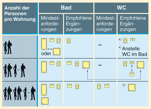 Im Bad einer Wohnung für zwei Personen sollte ein WC, ein Waschtisch und eine Badewanne oder eine Dusche vorhanden sein. Wenn es der Platz erlaubt, ist die Anordnung eines Bidets sinnvoll. WC, Waschtisch, Badewanne oder Dusche werden auch in einer Wohnung mit vier Personen als eine ausreichende Mindestausstattung angesehen. Hier sollten dem Kunden allerdings ein Bidet, ein zweiter Waschtisch und eine zusätzliche Dusche empfohlen werden. Sinn macht auch die Einrichtung eines Gäste-WC’s mit WC und Handwaschbecken. Dabei ist zu überlegen, ob hier anstelle eines kleinen Handwaschbeckens der erwähnte zweite Waschtisch unterzubringen ist. Auch die empfohlene zusätzliche Dusche könnte hier ihr Plätzchen finden. Dann wird das „Gäste-WC“ zum vollwertigen Zweitbad – was in einem Vier-Personen-Haushalt möglicherweise die bereits erwähnte morgendliche Hektik etwas entschärft. Für einen Haushalt mit bis zu sechs Personen sind Badezimmer und Gäste-WC erforderlich. Im Bad müssen mindestens WC, Waschtisch, Badewanne und Dusche vorhanden sein. Sehr sinnvoll sind hier ein zweiter Waschtisch und ein Bidet. Im Gäste-WC sollte über die Anordnung eines Urinals und einer zusätzlichen Dusche nachgedacht werden, denn auch für den Sechs-Personen-Haushalt macht ein Zweitbad Sinn.