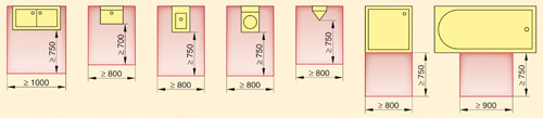 Die Objekte müssen jedoch nicht nur im Raum „untergebracht werden“. Sie müssen so angeordnet werden, dass eine uneingeschränkte Benutzung möglich ist. Das klingt logisch, wird in der Praxis aber oft mit Füßen getreten. Da findet man zum Beispiel ein hochwertiges Bad, in dem WC und Bidet nicht nebeneinander, sondern an entgegengesetzten Stellen des Badezimmers angeordnet wurden. Wer so etwas plant, der hat mit Sicherheit nicht begriffen, dass man sich auf einem Bidet nach der WC-Benutzung sein Hinterteil waschen soll. Und ein Handtuch-Wärmekörper, der nicht neben der Dusche angeordnet ist, zwingt den Benutzer dazu, nass durch das ganze Bad zu laufen, um das Handtuch zu erreichen. Natürlich soll man Wert auf eine optisch schöne Anordnung der Ausstattung legen; es darf aber die Funktionalität nicht auf der Strecke bleiben. Dazu gehört es auch, den einzelnen Sanitärobjekten ausreichenden Benutzerplatz einzuräumen. Für jedes Sanitärobjekt ist eine Bewegungsfläche festgelegt, die für die Benutzung des Objektes geringstenfalls erforderlich ist. Allerdings sind diese Mindestabstände sehr knapp bemessen. Sie ermöglichen zwar die Benutzung der Sanitärobjekte, lassen aber keinerlei Komfort zu. Wenn es die räumlichen Vorraussetzungen zulassen, sollte man die Abstände großzügiger auslegen. Da man davon ausgehen kann, dass ein Bad im Normalfall von immer nur einer Person benutzt wird, dürfen sich die Bewegungsflächen der einzelnen Objekte überlagern. Dadurch reduziert sich der Platzbedarf und macht auch in kleineren Räumen komfortable Bewegungsflächen möglich.