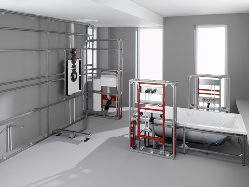 WC und Bidet sollten nach Möglichkeit dagegen immer so platziert sein, dass diese beim Betreten des Raumes nicht direkt zu sehen sind. Das bedeutet aber nicht grundsätzlich eine Anordnung „hinter der Tür“. Moderne Vorwand-Installationssysteme erlauben es, sich von einer Installation „an der Wand entlang“ zu lösen. Die selbsttragenden Elemente ermöglichen es dem Anlagenmechaniker Raumteiler zu schaffen, an denen Sanitärobjekte angebracht werden können. So entsteht schnell eine Intimzone mit WC und Bidet im Bad und der Raum wird optisch aufgelockert.