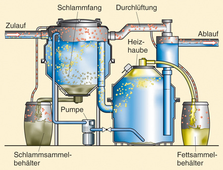 Dafür, Fette aus dem Rohr rauszuhalten, gibt es aber noch einen andern Grund: Fette und Öle verwandeln sich im Wasser durch chemische und biologische Reaktionen in die übel riechende Fettsäuren. Diese Säuren sind sehr aggressiv und führen zur Korrosion. Es sind schon Fälle bekannt geworden, bei denen Fettsäuren selbst die sonst korrosionsresistenten Gussrohre beschädigten. Noch schlimmer sind aber die Folgen in den Klärwerken. Dort setzten sich die Fette und Öle auf dem Belebschlamm ab und verhindern den erforderlichen Sauerstoffaustausch. Eine biologische Klärung der Abwässer wird damit unmöglich. Unter diesen Gesichtspunkten ist es nur logisch, dass Fette und Öle nicht in zu umfangreichem Maße in das Entwässerungssystem gelangen dürfen. Sie müssen so schnell wie möglich – also nach möglichst kurzem Fließweg innerhalb der Abwasserleitungen – aus dem Wasser abgeschieden werden. In den Entwässerungssatzungen der Städte und Gemeinden ist meistens festgelegt, dass pro Liter abfließenden Abwassers nicht mehr als 250 mg an Ölen und Fetten in das öffentliche Kanalnetz eingebracht werden dürfen. Geht man davon aus, dass niemand die häusliche Spüle zur Entsorgung purer Fettreste aus Pfannen und Töpfen missbraucht, wird der Grenzwert beim Geschirrspülen nicht überschritten. Die Fettanteile im Abwasser reiner Wohngebäude sind also kein Problem.