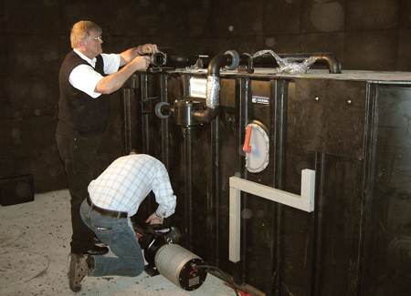 Damit der Abscheidevorgang nicht gestört wird, muss die Aufbindung einer Fallleitung auf die Zuleitung zum Abscheider in einem Abstand von mindestens 10 x DN der Zuleitung zum Abscheideranschluss liegen. Darüber hinaus muss die Umlenkung einer Fallleitung auf die liegende Leitung mittels 45°-Abzweig, einem 25 cm langen Zwischenstück und einem 45°-Bogen ausgeführt werden. Auf diese Weise wird die Fließenergie aus dem Wasser genommen und das Wasser beruhigt sich. Und genau diese Ruhe ist wichtig, damit der Abscheidevorgang klappt und sich die nachgeschalteten Rohre weder zusetzen noch Opfer von Korrosion werden. JS