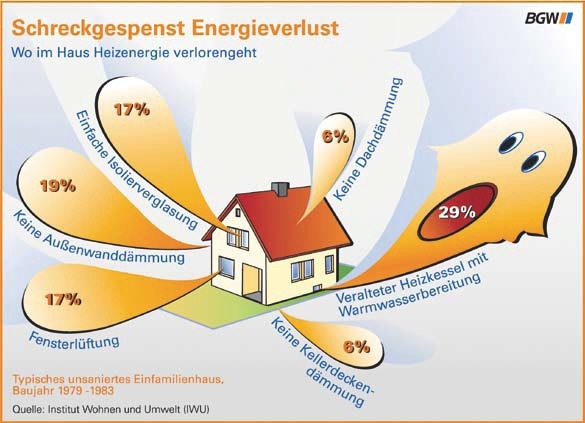 So gehen über nicht oder nur unzureichend gedämmte Dächer sechs bis 13 Prozent der Wärmeenergie verloren. Schlecht gedämmte Fassadenwände lassen etwa 18 bis 25 Prozent der Wärmeenergie ungenutzt entweichen. Einfach verglaste Fenster erhöhen das Defizit nochmals um rund 17 Prozent. Und das sind nur einige wenige Beispiele für mögliche Einsparpotenziale. Werden diese Wärmeverluste unterbunden und kommt dazu eine moderne und effiziente Heizungstechnik zum Einsatz, sind erhebliche Heizkosteneinsparungen möglich.