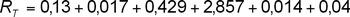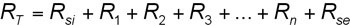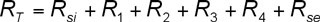 Umgangssprachlich könnte man sagen: Addiere alle Einzelwiderstände zu einem Gesamtwiderstand (RT) auf. Die Einzelwiderstände setzen sich zusammen aus dem ersten (Rsi) und letzten (Rse) vom gleichen Typ, sowie die „Schichtwiderstände“ 1 (R1) bis zur letzten (n-ten) Schicht (Rn). Die als Übergangswiderstände bezeichneten Rsi und Rse ergeben sich aus Tabellen.