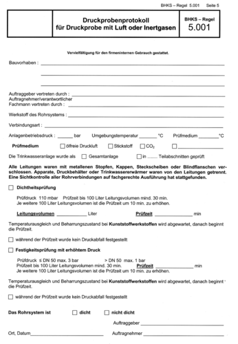 Wichtig: Da die DIN 1988 einen verbindlichen Ausführungscharakter besitzt, müssen sie unbedingt in einem Nebenvertrag mit ihren Kunden die Dichtheitsprüfung nach ZVSHK- oder BHKS 5.001- Merkblatt vereinbaren und die Dichtheitsprüfung nach DIN 1988 T.2 ausschließen.