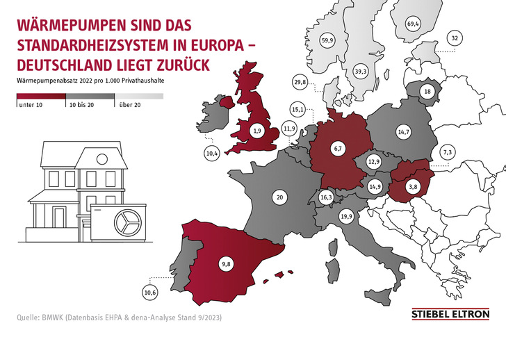 Beim Wettlauf um klimafreundliches Heizen in Europa wird Deutschland von seinen Nachbarn abgehängt: Die Bundesrepublik liegt bei den Absatzzahlen von Wärmepumpen pro 1.000 Haushalte mit nur rund 7 Geräten auf dem drittletzten Platz. Das zeigt die Statistik der European Heat Pump Association (EHPA). In Finnland haben 69, in Norwegen rund 60 und in Schweden 39 von 1.000 Haushalten 2022 eine Wärmepumpe eingebaut. Die rote Laterne trägt Großbritannien (2 Einheiten), Vorletzter ist Ungarn (4 Einheiten).