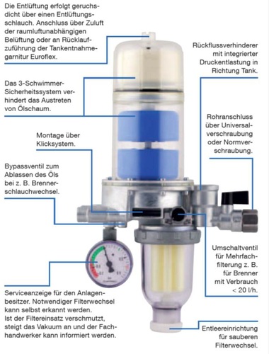Der Entlüfter hat eine aufgesetzte Kunststoff-Entlüfterhaube, ein Zink-Druckgussgehäuse und eine lange Kunststoff-Filtertasse. Die Entlüfterhaube verfügt über zwei getrennte Schwimmerkammern, wobei sich in der unteren Kammer Arbeits- und Entlüftungsschwimmer und in der oberen Kammer Sicherheitsschwimmer und Entlüftungsöffnung befinden. Das Austreten von Ölschaum wird durch dieses 3-Schwimmer-Sicherheitssystem verhindert. Mit montiertem Entlüftungsschlauch ist der Entlüfter geruchsdicht (PROOFED BARRIER). Im Gussgehäuse befindet sich ein Umschaltventil für die Einfach-/Mehrfachfilterung, ein Absperrventil zum Absperren der Saugleitung (zur Überprüfung der Saugleistung der Brennerpumpe), ein Rückflussverhinderer mit Druckentlastung in Richtung Tank, ein Bypassventil (zum Ablassen des Öls bei einem Brennerschlauchwechsel) und eine Entleereinrichtung für einen sauberen Filterwechsel.