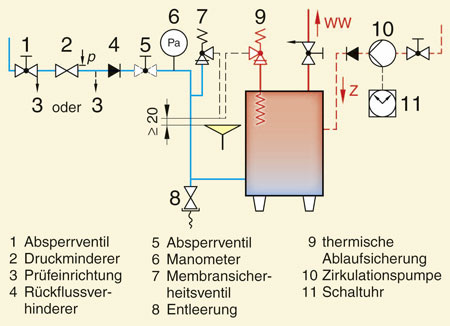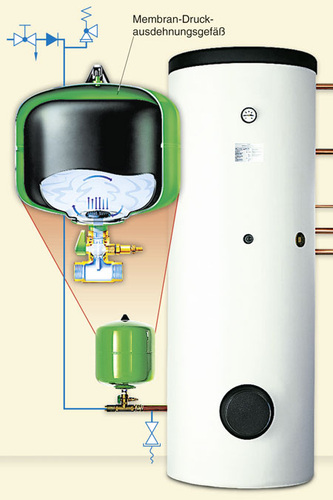 Kurz vor dem Speicher erfolgt der Anschluss des Membransicherheitsventils. Obwohl dieses Sicherheitsventil in unregelmäßigen Abständen erneuert werden muss, ist eine Absperrung im Zulauf natürlich nicht zulässig. Denn das Sicherheitsventil stellt die letzte Funktionseinheit dar, die ein Platzen des Trinkwassererwärmers bei Überdruck verhindern kann. Das Sicherheitsventil sollte, damit es ohne großen Wasserverlust austauschbar ist, über dem Wassererwärmer angeordnet sein, ohne dafür lange Zuleitungen legen zu müssen. Für Durchlaufwasserheizer mit einem Wasserinhalt von weniger als drei Litern ist kein Sicherheitsventil nötig. Damit in einem Durchlaufwasserheizer kein Überdruck beim Erwärmen entsteht, darf kein Rückflussverhinderer vorgeschaltet werden.