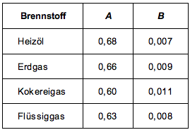 Die beiden festen Werte A und B sind abhängig vom eingesetzten Brennstoff. Folgende Werte wurden der BImSchV entnommen: