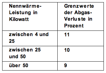 Der Abgasverlust dieser Anlage beträgt also 11,7 %, gerundet 12 % und erfährt prompt eine Bewertung. Nach BImSchV ist dieser Wert für einen ölbefeuerten Kessel mit 25 kW Leistung inakzeptabel. Diese Annahme rührt aus der Tatsache, dass die BImSchV nicht nur die Messanweisung vorgibt sondern auch Grenzwerte vorschreibt. Diese maximalen Abgasverluste betragen abhängig von der Leistung: