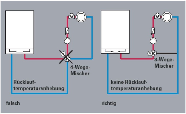 Als Alternative können 3-Wege-Mischer zum Einsatz kommen. Sie führen das Rücklaufwasser aus den Heizkreisen direkt, ohne Temperaturanhebung, dem Brennwertkessel zu.
