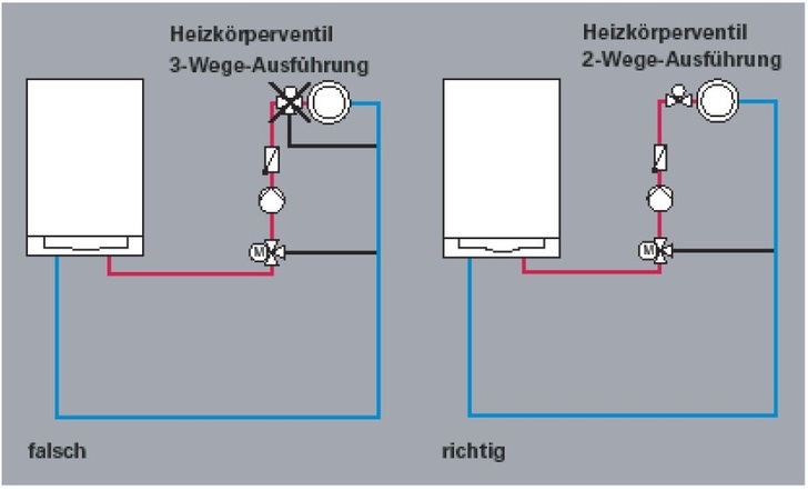 Außerdem sollten auch 3-Wege-Thermostatventile nicht eingesetzt werden, da sie für eine direkte Verbindung von Vor- und Rücklauf und damit zu einer Rücklauftemperaturanhebung führen.