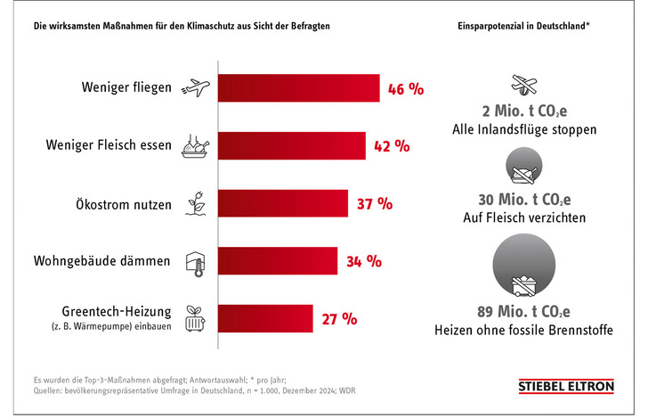 Die Verbraucherinnen und Verbraucher in Deutschland irren bei der Frage nach der Wirksamkeit unterschiedlicher Klimaschutz-Maßnahmen: „Weniger mit dem Flugzeug fliegen“ „Weniger Fleisch essen“, „Ökostrom nutzen“ und „Wohngebäude dämmen“ werden von der Bevölkerung als die wichtigsten Hebel genannt. Der größte Teil der CO2-Emissionen in privaten Haushalten geht jedoch auf das Konto fossiler Brennstoffe, die für die Wärmeerzeugung eingesetzt werden: 82 Prozent der Endenergie, die ein Haushalt benötigt, wird für Heizung und Warmwasserbereitung genutzt.