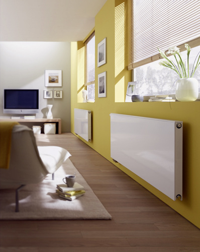 Die Einsatzmöglichkeit des Plattenheizkörpers ist mittlerweile als fast universell anzusehen. Auch öffentliche Gebäude, die ehemals häufig mit robusten Radiatoren ausgestattet wurden, erscheinen heute schon mal im moderneren Look der Platte. Bauhöhe und Länge ist variabel bestellbar. Die Bautiefe resultiert aus der Anzahl der Platten. Bis zu drei Stück werden in der Standardfertigung hintereinander gesetzt. Und jede Platte kann dann noch die so genannten Konvektorbleche erhalten. Einerseits wird also die Strahlung durch eine ausgeprägte Fläche forciert. Andererseits sorgen die Konvektorbleche für die besten Bedingungen um erwärmte Luft aufsteigen zu lassen, also Konvektion zu erzeugen. Diese Eier legenden Wollmilchsäue haben sich daher am stärksten verbreitet. Die Oberfläche der Körper ist von Hause aus meistens profiliert. Diese Maßnahme stabilisiert das Blech und verringert gleichzeitig die Empfindlichkeit gegen Dellen. Es gibt auch die Ausführung als Planheizkörper mit glatten Fronten. Diese sind dann zwar empfindlicher, aber auch, zum Beispiel für Krankenhäuser, leichter zu reinigen.