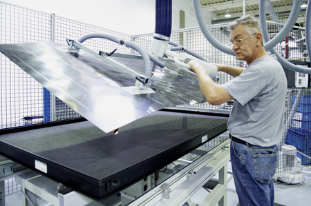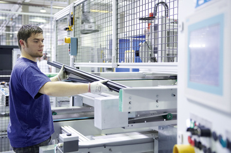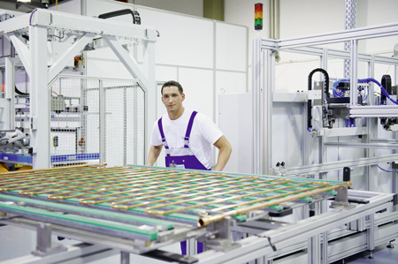 Ein Mitarbeiter „füttert“ einen Fertigungsroboter mit Aluminiumprofilen, die der Roboter zum Kollektorrahmen zusammenpresst (Bild 3). Anschließend klebt der Roboter auch noch das Bodenblech in den Rahmen ein. Klebetechniken haben - verglichen mit den Anfängen der Kollektorproduktion - einen erheblichen Aufschwung erlebt. Die thermische Belastbarkeit von Klebeverbindungen ist ein wichtiges Kriterium beim Kollektorbau und hat sich seither enorm verbessert. Vor dem Hintergrund, dass eine Solaranlage auch Temperaturen von über 200 °C erreichen kann, ist dies sehr wichtig. Nebenbei, auch der Anlagenmechaniker berücksichtigt die außergewöhnlich hohen Spitzentemperaturen der Solaranlagen. Im Zusammenhang mit der Dämmung der Vor- und Rücklaufleitungen einer Solaranlage werden Dämmstoffe eingesetzt die auch mal Temperaturen von 150 °C verkraften.