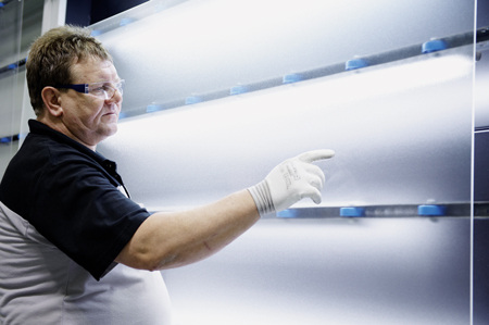 Als nächstes wird eine Matte aus Mineralwolle in den Rahmen eingelegt, um Wärmeverluste des Kollektors nach hinten zu vermeiden. Dabei handelt es sich um schwarz kaschierte Mineralwolle in einer Dicke von 40 mm bei einem Wärmedurchgangskoeffizienten (umgangssprachlich Lambda-Wert) von 0,035 W/(mK). Rein rechnerisch ergibt sich für die Rückseite des Kollektors damit ein U-Wert von etwa 0,7 W/(m²K). Dann werden die Durchführungen für die hydraulischen Anschlüsse mit dem Kollektorrahmen vernietet. Durch Steckverbindungen lassen sich die Absorber später, bei der Installation, schnell, sicher und werkzeugfrei untereinander und mit dem Rohrsystem verbinden. Auf dem Dach eines Hauses sollte es eben nicht zu kompliziert zugehen. Würde man das Bauteil in diesem Zustand ausliefern, so würde es seinen Dienst, als Erntegerät für Solarstrahlung bereits aufnehmen können. Allein der Wirkungsgrad wäre an kalten Tagen sehr schlecht. Im nächsten Schritt muss daher ein gläsernes Häubchen aufgesetzt werden. Dazu wird eine Kollektorscheibe erstmal penibel gereinigt. Anschließend wird ein äußerst präziser multifunktionaler Sensor eingesetzt, nämlich das menschliche Auge (Bild 5). Das Glas, das später über viele Jahrzehnte, man rechnet zwischen 20 und 50 Jahren, hohe Erträge an thermischer Solarenergie durchlassen soll, wird auf Verunreinigungen, Kratzer und Luftbläschen untersucht. Die Eigenschaften dieses Glases sind natürlich ebenfalls der Aufgabe angepasst. Ein Maximum an Sonnenstrahlung, hier über 90 %, soll durch das Sicherheitsglas wandern und auf den Kollektor treffen.