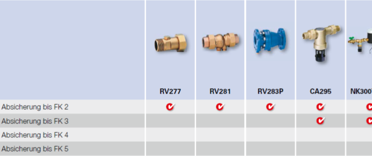 Die Broschüre „Trinkwasserschutz auf höchstem Niveau“ erklärt die Flüssigkeitskategorien anhand von praxisnahen Applikationsbeispielen und erläutert anschaulich, welche Sicherungsarmatur zur Absicherung zu verwenden ist. Flüssigkeiten der Kategorie 2 treten zum Beispiel bei Zapfanlagen oder Getränkeautomaten auf und erfordern mindestens den Einbau eines prüfbaren Rückflussverhinderers Typ EA. Bade- und Heizungswasser zählen zur Flüssigkeitskategorie 3 und werden durch einen direkt gesteuerten Rohrtrenner Typ GA oder einen Systemtrenner Typ CA abgesichert. In chemischen Anlagen benötigt man durchflussgeregelte Rohrtrenner Typ GB oder Systemtrenner Typ BA, um gegen Flüssigkeiten der Kategorie 4 abzusichern. Flüssigkeiten der Kategorie 5 bedingen einen freien Auslauf des Typs AA oder AB, beispielsweise in der Landwirtschaft, bei Biolaboren oder bei Feuerlöschanlagen.