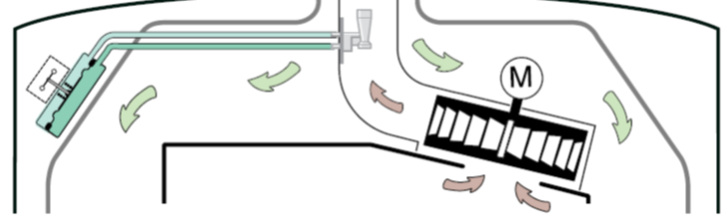 Bei Geräten mit geschlossener Verbrennungskammer hat der Ventilator die Aufgabe, die für die Verbrennung benötigte Frischluft an den Brenner heranzuführen und die bei der Verbrennung entstandenen Abgase ins Freie abzuleiten.