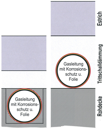 Bei Innenleitung muss grundsätzlich zwischen einer Umhüllung der Rohrleitung zwecks Schalldämmung und einer Korrosionsschutzmaßnahme unterschieden werden. Auch Gasleitungen benötigen die Anwendung von Schallschutzmaßnahmen. Etwa dann, wenn diese Geräte wie Kombi- oder Durchflusswasserheizer versorgen. Hier sind sie kraftschlüssig angeschlossen, was eine Weiterleitung von Körperschall auf das Mauerwerk ohne Anwendung geeigneter Schutzmaßnahmen ermöglichen würde. Die verwendeten Schalldämmschläuche müssen dabei nicht zwangsläufig auch die Anforderungen an den notwenigen Korrosionsschutz erfüllen. Da umgekehrt ein guter Korrosionsschutz noch lange keinen ausreichenden Schallschutz sicherstellt, muss die Gasleitung in vielen Fällen „doppelt angezogen“ werden, nämlich erst durch Korrosionsschutz geschützt und dann mit geeignetem Schallschutz versehen. Und dann hängt die Auswahl des Korrosionsschutzes von dem Bereich des Gebäudes ab, in dem die Leitung verlegt werden soll, sowie von der Rohrart die verwendet wird.