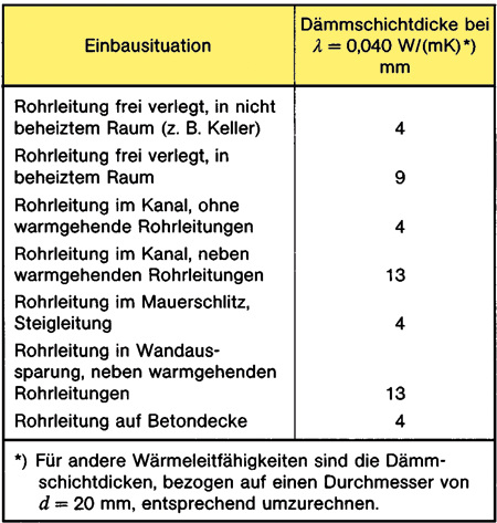 - Rohrleitungen mit einem Innendurchmesser bis 22 mm müssen mit einer Dämmschichtdicke von 20 mm gedämmt werden