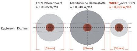 Diese Vorgaben gelten als so genannte 100-prozentige Dämmung. Natürlich gibt ein 100-prozentig gedämmtes Rohr noch Wärme ab. Wenn von 100-prozentiger Dämmung gesprochen wird, bedeutet das nicht, dass das Rohr gar keine Wärmeverluste mehr hat. Das erlebt man am deutlichsten, wenn Frost ins Spiel kommt: Ein wasserführendes Rohr kann noch so dick gedämmt sein - steht das Wasser in diesem längere Zeit, gefriert es irgendwann. Das Einfrieren von wasserführenden Leitungen lässt sich also auch bei dickster Dämmung nur verzögern, nicht verhindern. Wer also 100prozentig dämmt, der verhindert nicht sämtliche Energieverluste, sondern bringt den Dämmstoff lediglich in der Dicke auf, wie es die EnEV fordert. Aber Vorsicht: Das bedeutet nicht, dass man nur irgendwas dick genug ums Rohr wickeln muss. Das Butterbrotpapier und die Plastiktüte scheiden hier schon mal aus. Wichtig ist in diesem Zusammenhang die nachgewiesene Qualität der Dämmung bezüglich der Dämmeigenschaft. Gefordert wird die Dämmschichtdicke von z. B. 20 mm für ein Kupferrohr 15 x 1 mm bei einer Wärmeleitfähigkeit des verwendeten Dämmstoffes von 0,035 W/(m∙K), also der Wärmeleitfähigkeitsgruppe (WLG) 035. Verwendet man einen Dämmwerkstoff mit geringerer Dämm¬eigen¬schaft (z. B. WLG 040 ), ist die Dämmung entsprechend dicker auszuführen. Umgekehrt kann die Dämmung dünner ausfallen, wenn das Dämmmaterial entsprechend bessere Eigenschaften, also eine geringere Leitfähigkeit (z. B. WLG 025) aufweist.