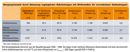 Ein blankes Kupferrohr kann durchaus als Heizkörper angesehen werden. Der laufende Meter eines Kupferrohres, mit 15 mm Außendurchmesser und einer Wanddicke von 1 mm, gibt immerhin fast 50 Watt Leistung an einen 20-grädigen Raum ab, wenn Heizungswasser mit einer Temperatur von rund 60 °C durch das Rohr fließt. Um also 1000 Watt zu erreichen bräuchte man nur runde 20 Meter dieses Rohres zu verlegen und könnte dann auf einen teuren Heizkörper verzichten. Dämmt man dieses Rohr jedoch in guter Qualität (Wärmeleitfähigkeitsgruppe 040) mit 27 mm, reduziert sich die Leistung auf 6 Watt je laufenden Meter. Um dann noch 1000 Watt Wärmeabgabe zu erreichen müssten über 167 Meter verlegt werden. Dieser Vergleich soll klar machen, dass ungedämmte Rohre schon in einem Einfamilienhaus schnell die Leistung eines Heizkörpers mit 1000 Watt erreichen. Allerdings kann man einen echten Heizkörper in der Regel auch drosseln oder abschalten, während die Auskühlverluste der ungedämmten Rohrleitungen planlos vor sich hin verschwendet werden. Setzt man für Deutschland überschlägig 1800 Vollbenutzungsstunden einer Heizungsanlage an, dann werden im Beispiel mit 1000 Watt Leistung, sehr schnell 1000 Watt x 1800 h, also sage und schreibe 1800000 Wattstunden verbraten. Und das sind bekanntlich 1800 kWh. Dies entspricht der Heizenergie von 180 Litern Heizöl oder 180 Kubikmetern Erdgas. Wohlgemerkt, ohne Komfortgewinn für den Betreiber der Anlage. Bei einer Heizungsanlage zielt die Dämmung der Rohrleitungen klar auf die Einschränkung der Energieverluste.