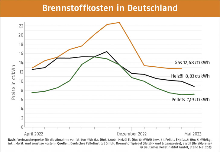 Im Mai kostet eine Tonne Pellets laut dem Deutschen Pelletinstitut (DEPI) durchschnittlich 359,41 Euro. Damit bleibt der Pelletpreis weiterhin stabil und liegt rund acht Prozent unter Vorjahresniveau. Eine Kilowattstunde Wärme aus Pellets ist demnach für 7,19 ct zu haben. Zu Heizöl mit knapp 19 Prozent und zu Erdgas mit rd. 45 Prozent bleibt der Preisvorteil weiterhin groß. Erfahrene Verbraucher nutzen die Jahreszeit daher zur Auffüllung des Pelletlagers.