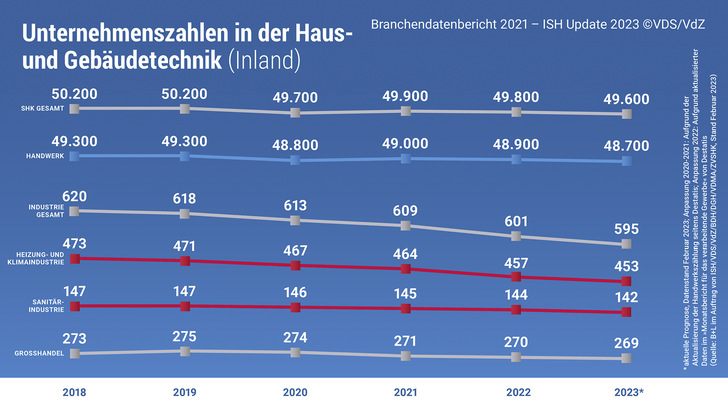 Die Haus- und Gebäudetechnikbranche zeigt sich multikrisenresistent und kann auch im dritten Jahr in Folge ihr Umsatzwachstum mit +8,8 % dynamisch fortsetzen. Die anhaltende starke Nachfrage nach energetischen Sanierungen wirkt sich positiv auf die Branche aus. Die Umsätze im Wirtschaftsbereich haben sich aufgrund der gestiegenen Preise besser entwickelt als die abgesetzten Mengen. Auch für das Jahr 2023 werden steigende Umsätze erwartet. Der Bereich Heizung und Lüftung profitierte von staatlicher Förderung im Rahmen des Klimapakets bei den Bestandsmaßnahmen. Lieferengpässe verzögern die Umsetzung von Projekten und wirken sich negativ aus. Die Umsätze in der Heizungs-, Kälte-, Klima- und Lüftungsbranche erreichten im Jahr 2022 insgesamt ca. 46,9 Mrd. Euro.
