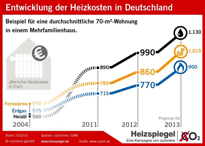 Folgende Bespiele aus dem Bundesweiten Heizspiegel 2013, der Vergleichswerte für das Abrechnungswerte 2012 enthält, machen die Mehrbelastung für die Bewohner einer durchschnittlichen 70-Quadratmeter-Wohnung in einem 500 – 1.000 m²-großen Gebäude