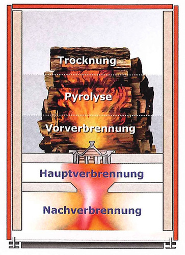 Dazu muss man wissen, dass Holz bestmöglich in drei Stufen verbrennt und dabei die gespeicherte Energie abgibt. Um den Rohstoff Holz also umwelt- und nachbarschaftsfreundlich zu verbrennen ist es wichtig, dass die einzelnen Schritte optimal ablaufen können. Dabei sind die Holzfeuchte, die Verbrennungstemperatur und der zugeführte Luftsauerstoff von entscheidender Bedeutung. Das Klimagas Kohlendioxid entsteht bei der Verbrennung von unbehandeltem Holz übrigens nur so viel, wie der Baum während seines Wachstums aufgenommen hat. Man spricht daher von einer klimaneutralen Energiegewinnung. Im ersten Schritt wird das Holz erwärmt und die Restfeuchte an der Oberfläche kann entweichen. Die Energie dazu liefert häufig ein Kaminanzünder, etwas Zeitungspapier, ein elektrischer Glühzünder oder ein Heißluftfön. Dann beginnt im zweiten Schritt das Holz an der Oberfläche zu entgasen (pyrolysieren). Diese Gase verbrennen mit einer hellen Flamme an der Holzoberfläche. Ein Teil der Wärme wird als Nutzwärme abgegeben oder geht mit den Abgasen verloren. Der Rest strahlt zurück auf das Holz und erwärmt tiefere Holzschichten um den Prozess aus Trocknung und Pyrolyse aufrecht zu erhalten. Aus dem entgasten Holz wird schließlich Koks oder auch Holzkohle, welcher im dritten Schritt verglüht und dabei wiederum Wärme freisetzt.