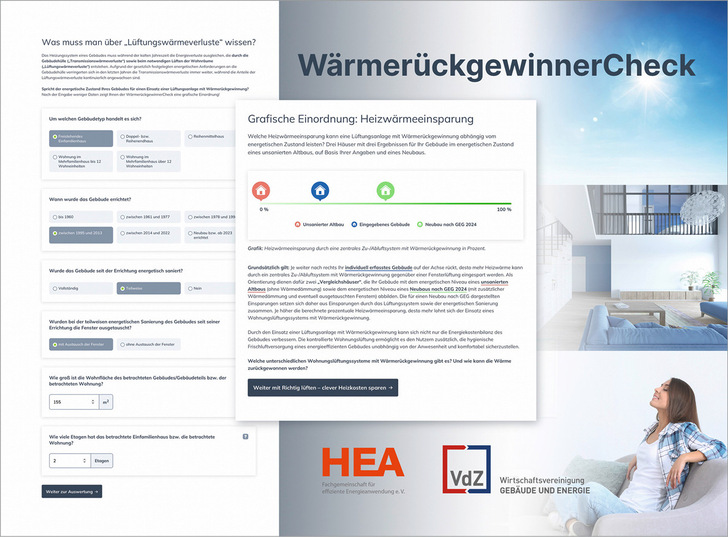 Der von HEA und VdZ konzipierte, kostenfreie WärmerückgewinnerCheck informiert Haus- und Wohnungseigentümer, wie unsichtbare Risiken in der Raumluft wie Kohlendioxid, Feuchtigkeit oder Schadstoffe mit durchdachten Lüftungslösungen „vor die Tür gesetzt“ werden. Nach der Eingabe einiger weniger Daten liefert der WärmerückgewinnerCheck eine grafische Einordnung der möglichen Heizwärmeeinsparung. Um eine Einschätzung des individuellen Ergebnisses zu ermöglichen, wird die eingegebene Gebäudesituation in Relation zu einem unsanierten Altbau ohne Wärmedämmung sowie zu einem energetisch optimierten Neubau gemäß Gebäudeenergiegesetz (GEG) 2024 gesetzt. Auf diese Weise erhält der Nutzer eine vergleichende Perspektive auf die potenzielle Verbesserung der Energiebilanz seines Gebäudes durch den Einsatz einer Lüftungsanlage mit Wärmerückgewinnung. Der WärmerückgewinnerCheck bietet darüber hinaus Informationen zu Installation und Wirkung moderner Lüftungssysteme. Neben Energie- und Kosteneinsparungen werden die Vorteile wohnungsbezogener Lüftungssysteme für den Alltag erläutert. Das Ergebnis umfasst eine ausführliche PDF-Datei mit der individuellen Berechnung sowie detaillierten Informationen zur Wohnungslüftung mit Wärmerückgewinnung. Das interaktive Tool wird kostenfrei von HEA und HEA – Fachgemeinschaft für effiziente Energieanwendung bereitgestellt. Die wissenschaftliche Begleitung erfolgte in Zusammenarbeit mit dem ITG Institut für technische Gebäudeausrüstung Dresden Forschung und Anwendung GmbH.