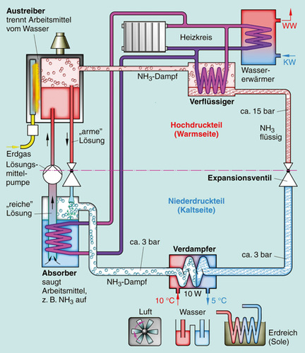 Im Gegensatz zur Kompressions- WP hat die Absorptions-WP keinen Verdichter. An Stelle des Verdichters befinden sich ein Absorber, eine Lösungsmittelpumpe, ein Austreiber sowie ein zweites Expansionsventil. Das Betriebsmittel, mit dem diese Wärmepumpe arbeitet, muss wasserlöslich sein, wie z. B. Ammoniak (NH3). Im Verdampfer geschieht bei der Absorbtions-WP dasselbe wie bei der Kompressions-WP. Nach dem Verdampfer strömt das dampfförmige Betriebsmittel allerdings in den Absorber. In diesem wird das dampfförmige Betriebsmittel vom Wasser des Absorbers aufgenommen, also absorbiert. Da beim Absorptionsvorgang schon Wärme entsteht, wird diese mit einem gesonderten Wärmetauscher frühzeitig „abgeschöpft“. Das in dem Absorber entstandene flüssige Wasser-Betriebsmittel-Gemisch steht nur unter geringem Druck. Auch ist noch kein wesentlicher Temperaturanstieg erfolgt. Die Flüssigkeitspumpe, die nach dem Absorber eingebaut ist, transportiert das Gemisch in den Austreiber. Dabei erhöht sie den Druck des Gemisches. Der Austreiber, in dem nun das flüssige Gemisch gelangt ist, hat die Aufgabe, die Mixtur wieder zu trennen. Die Trennung erfolgt auf Grund der unterschiedlichen Siedetemperaturen von Wasser und Betriebsmittel. Eine nur sehr geringe Erwärmung reicht schon aus, um das Betriebsmittel wieder aus dem Wasser auszutreiben. Der Vergleich hinkt sicher - aber es ist so, als würde man das Wasser in einer vollen Badewanne mit der Flamme eines Feuerzeuges zum sieden bringen. Das Betriebsmittel liegt nun wieder gasförmig und das Wasser weiterhin flüssig vor. Das unter Druck stehende Wasser wird über einem zusätzlichen Expansionsventil in den Absorber zurückgeführt. Der heiße Betriebsmitteldampf hat ab dem Austreiber den gleichen Weg wie bei der Kompressions-WP.