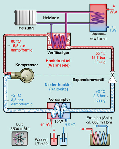 Der Verdichter ist meist ein Hubkolben- oder Rollkolbenverdichter und funktioniert mechanisch. In der Regel wird der Verdichter elektrisch angetrieben. Es gibt aber auch die Varianten mit Diesel- oder Gasmotor. Diese haben den Vorteil, dass die anfallende Abwärme genutzt werden kann. Der Verdichter ist vergleichbar mit einer Luftpumpe: er komprimiert das dampfförmige Betriebsmittel. Durch diese Kompression kommt ein enormer Temperaturanstieg zustande. Das nun dampfförmige und heiße Betriebsmittel strömt weiter zum Verflüssiger. Dieser wird auch Kondensator genannt. Der Verflüssiger ist wie der Verdampfer ein Wärmetauscher. Hier kommen Koaxial-, Topf- oder Lamellenverflüssiger zum Einsatz. Der Verflüssiger hat nun die Aufgabe, die Energie aus dem dampfförmigen, heißen Betriebsmittel an das Rücklaufwasser des Heizmediums abzugeben. Hierbei wird dem Betriebsmittel so viel Wärme entzogen das es kondensiert, den Aggregatzustand ändert und wieder flüssig vorliegt. Nun muss das dem nach dem Verflüssiger noch unter Druck stehende Betriebsmittel entspannt werden. Dies geschieht mit dem Expansionsventil. Das Ventil dient auch noch als Drosselventil, da es den Volumenstrom des Betriebsmittels regelt. Um die Regelung zu gewährleisten ist ein Fühler hinter dem Verdampfer eingebaut. Steigt die Temperatur zu hoch, öffnet das Ventil und das Betriebsmittel strömt schneller durch den Verdampfer, sodass weniger Energie aufgenommen wird. Wenn die Temperatur jedoch zu niedrig ist, reduziert das Ventil die Strömungsöffnung und das Mittel strömt langsamer durch den Wärmetauscher. Nachdem das Betriebsmittel nun wieder flüssig und entspannt ist, hat sich der Kreislauf geschlossen und beginnt von neuem.