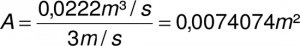 Für den auszulegenden Kanal wird daher ein Maximalwert für die Strömungsgeschwindigkeit festgelegt. Diese sollte kleiner oder gleich drei Meter pro Sekunde nicht überschreiten, wenn es sich, wie im Beispiel, um einen Nebenkanal handelt. Ein Hauptkanal kann auch mit fünf Meter pro Sekunde durchströmt werden. Die angenommenen 80 Kubikmeter bezogen auf eine Maximalgeschwindigkeit von drei Meter pro Sekunde benötigen also einen leicht berechenbaren Querschnitt:
