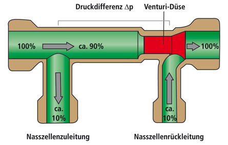 Daraus folgt, dass eine wirklich zuverlässige Spülung der Kaltwasserleitungen automatisch geschehen muss. Die renommierten Armaturen- und Sanitärprodukte- Hersteller Kemper und Geberit haben sich in Zusammenarbeit mit der Fachhochschule Münster dieser Problemstellung angenommen. Sie präsentierten auf der diesjährigen Weltleitmesse für Sanitär- und Heizungstechnik ISH eine vielseitige Lösung für die Sicherstellung der Hygiene. Kernstücke des Systems sind die Hygienespüleinheit und Venturi-Strömungsteilergruppen. In Gebäuden, wie Hotels oder Krankenhäusern, gibt es keine Einzelerfassung des Wassergebrauchs - also keine Wasserzähler auf den Etagen. Es können daher Venturi-Strömungsteilergruppen zum kaltwasserseitigen Anschluss der Sanitärräume an die Steigleitung eingesetzt werden. In den höchstgelegenen Sanitärräumen werden Hygiene-Spülungseinrichtungen eingebaut. Öffnen die Hygiene-Spülungseinrichtungen, ergibt das einen entsprechenden Volumenstrom in der Steigleitung. Vor den Venturi-Strömungsteilergruppen kommt es jeweils (eben durch die Venturi-Düse) zu einem Stau, nach der Venturidüse entsteht ein Sog. Der Staudruck und der Sog bewirken, dass sich ein kleiner Teil des Wassers den Umweg über die Leitungen des angeschlossenen Sanitärraumes sucht. Auf diese Weise werden auch die Rohre von Bädern in zeitweise unbewohnten Zimmern durchflossen.