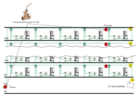 Bei der zeitgesteuerten Variante wird der Regelelektronik vorgegeben, wann gespült werden soll (z. B. jeden Montag, Spülung von 12:00 Uhr bis 12:10 Uhr). Variante Nummer zwei stellt der volumenstromgesteuerte Spülprozess dar. Dabei wird die Regelung auf das berechnete Spülvolumen programmiert. Mittels eines motorbetätigten Spülventils, einer Durchflussmessarmatur und motorbetätigten Absperrungen in den Stockwerksleitungen des Kaltwassersystems, können die Rohre der einzelnen Etagen nacheinander gespült werden. Spülungsvariante Nummer drei ist die der temperaturabhängigen Auslösung. Dabei werden die Wassertemperatur am Hausanschluss und die Wassertemperatur im weiteren Verlauf des Rohrleitungssystems (vorzugsweise jeweils in der Zuleitung zu dem entfernt liegendsten Sanitärraum) gemessen. Die Regelung wird auf eine Temperaturdifferenz programmiert. Nach der DIN 1988 [1] darf kaltes Trinkwasser nicht wärmer als 25 °C sein. Geht man davon aus, dass das kalte Wasser mit maximal 15 °C geliefert wird, darf die besagte Temperaturdifferenz maximal 10 K betragen. Da es nicht sinnvoll ist, bis zur Spülungsauslösung das Erreichen der maximalen Temperatur abzuwarten, wird eine geringere Temperaturdifferenz als die von 10 K zugrunde gelegt. Wird beispielsweise eine Temperaturdifferenz von 3 K einprogrammiert und am Hausanschluss beträgt die Wassertemperatur 15 °C, wird ein Spülvorgang ausgelöst, wenn ein Temperatursensor vor einem entfernt liegenden Sanitärraum mehr als 18 °C Wassertemperatur meldet.