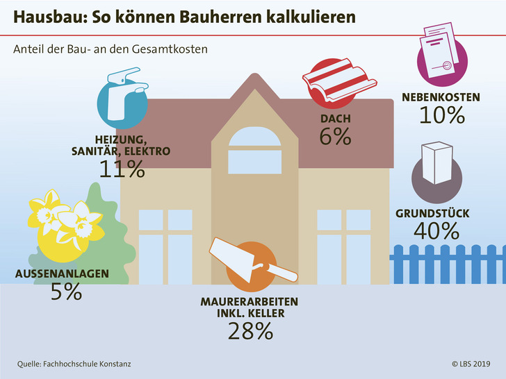 Das Eigenheim ist für viele Menschen einer der größten Träume im Leben – und einer der kostspieligsten: Rund 1600 Euro Gesamtkosten pro Quadratmeter sollten künftige Eigentümer für ihren Neubau einplanen. Mit einer durchdachten Wahl von Grundstück, Haustyp und Gestaltung lässt sich dieser Betrag erheblich reduzieren. Weitere Tipps auf www.lbs.de