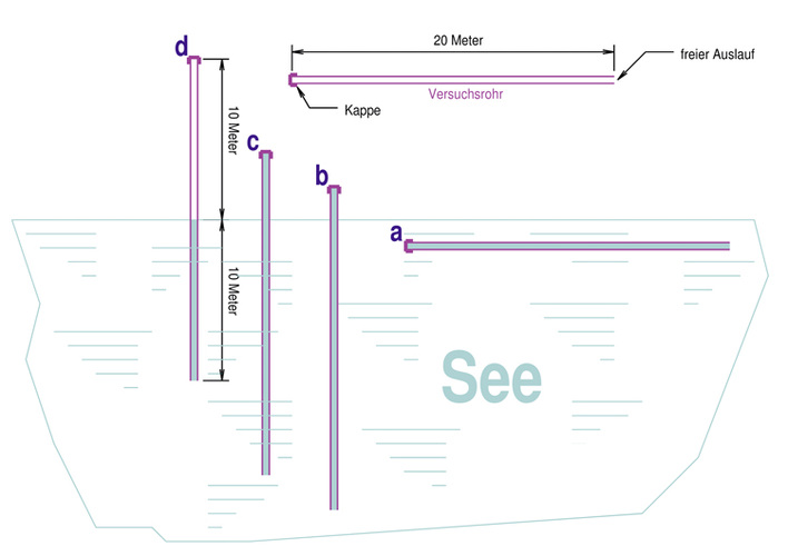 Betrachtet man diese physikalischen Gesetze, sollte man zuerst sämtliche Daten zur Umgebung festhalten. Gehen wir also von einem Tag an einem tiefen See mit einer Umgebungs- und Wassertemperatur von ca. 10 °C aus. Der Luftdruck beträgt genau 1000 Millibar (abgekürzt mbar). Die umgangssprachliche Erdanziehung soll völlig normal wirken und einen Wert von rund 10 m/s annehmen. Das spezifische Gewicht von Wasser soll mit 1000 Kilogramm je Kubikmeter ausreichend genau berücksichtigt sein. Man könnte nun die ersten Schlüsse ziehen und das gesamte Geschehen höchst kompliziert beschreiben. Bleiben wir aber einmal an der Problemoberfläche und gehen mit gesundem Menschenverstand und ohne weitere Tabellenwerte über Wasser und Luft an das gestellte Ziel heran, später kann ja jeder nach belieben verfeinern. Gehen wir nun von einem völlig im See untertauchten Rohr aus (siehe Skizze). Das Rohr ist 20 Meter lang und kann, bei Bedarf, verlängert werden. Dieses Rohr ist aus Glas gefertigt und an einem Ende mit einer Kappe verschlossen. Das andere Ende ist komplett geöffnet. Nun hält man dieses Rohr senkrecht und zieht es Stück für Stück, das mit der Kappe verschlossene Ende nach oben gerichtet, aus dem Wasser heraus. Wie bei einem mit dem Daumen verschlossenen Trinkhalm wird man nun beobachten können, dass das Wasser in dem gläsernen Rohr hängen bleibt. Begründung: Die Kappe verhindert ein Eindringen von Luft und dieser Bereich zwischen Kappe und Wasser kann als komplett evakuiert angesehen werden. Nun wird dieses Rohr Meter für Meter senkrecht angehoben. Die Säule reist nicht ab bis eine Höhe des Rohres von rund zehn Metern erreicht wird. Bei dieser Höhendifferenz zwischen Wasseroberfläche und Oberkante Kappe rast der Wasserinhalt schlagartig in die Tiefe.