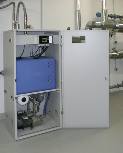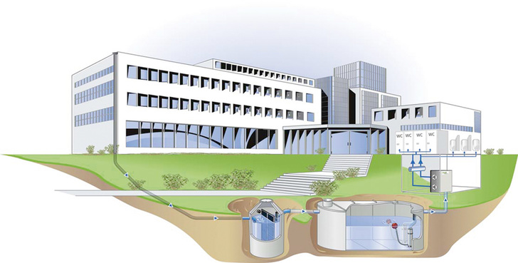 Ist der Behälter - z. B. im Sommer nach längerer Trockenzeit - bis auf den Löschwasservorrat von 200000 Liter entleert, wird mit der Regenwasser-Zentrale über eine Systemtrennung Trinkwasser zur WC- und Urinalspülung eingespeist. Diese Regenwasser-Zentrale mit elektronischer Steuerung, Doppelpumpendruckerhöhung und integriertem Vorlagebehälter steht im Gebäude. Unter Wasser in der großen unterirdischen Zisterne steht die Zubringerpumpe und fördert nach Bedarf, von der Regenwasser-Zentrale gesteuert. Die Druckerhöhungsanlage ist zweistufig, sitzt im kompakten Regencenter unter dem Zwischenbehälter und erhält so das Wasser im Zulaufbetrieb mit leichtem Vordruck. Bei Spitzenbedarf laufen beide Pumpen gleichzeitig, ansonsten abwechselnd einzeln. Sie verfügen über einen integrierten Trockenlaufschutz. Mit einem optischen und akustischen Signal weist die Steuerung auf Fehlfunktionen hin und reagiert darauf. Der potenzialfreie Störmelder ermöglicht eine Fernanzeige der Störung. Zudem verfügt die Steuerung über eine Anschlussmöglichkeit für RS 232-Schnittstellen zur externen Datenübermittlung.