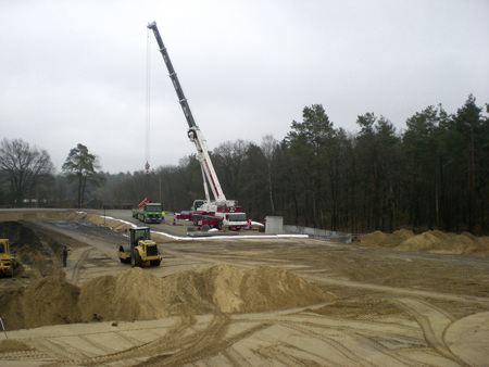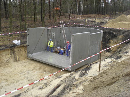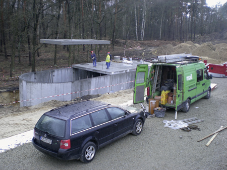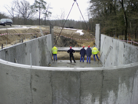 Die Betonfertigteile für den Regenspeicher der Brandenburger Schule wurden im Werk produziert und vom Hersteller vor Ort auf einem 15 cm hohen Sandbett versetzt und verschraubt. Innerhalb eines Tages konnten so die U-förmigen Segmente mit den zylindrischen Endstücken verschraubt werden, einschließlich der Abdeckplatten und Einstiegsöffnungen. Mit entsprechender Erdüberdeckung sind diese Behälter befahrbar. In den Zulauf des Speichers wurde der Filterschacht montiert. Schwebstoffe, die die Filterkassetten aus Edelstahlgewebe mit einer Maschenweite von 0,4 mm nicht passieren können, sinken als Feinteile zu Boden oder schwimmen auf an die Wasseroberfläche, wie z. B. Blütenpollen. Das mit dem Filter verbundene Ablaufrohr gewährleistet, dass weder Sediment noch Schwimmschicht in den Speicher gelangt. Entlüftung und Überlauf werden bei dieser Bauweise im Speicher oder im Filterschacht nach Bedarf angeordnet. Um die Planung zu erleichtern, trägt der Filterschacht als Produktbezeichnung die Zahl der maximal anschließbaren Dachfläche. In diesem Fall wurde an den Regenspeicher mit 300 m³ Fassungsvermögen ein Filterschacht mit der Typenbezeichnung FS 2500 angeschlossen. Das bedeutet, dass der Filter den Abfluss einer Dachfläche bis zu 2500 m² rückstaufrei bei dem zu Grunde gelegten Bemessungsregen von 300 l/s x ha verkraftet. Ist der Regenwasservorrat im unterirdischen Speicher ganz aufgefüllt sein und fällt weiterhin Niederschlagswasser an, wird der Speicherüberlauf in einen Regenwasserteich abgeleitet. Dort verdunstet ein Teil, ein Teil versickert. Der Teich wurde als Teil der Landschaft biotopartig angelegt. Das macht natürlich optisch sehr viel mehr her als ein rein technisches Versickerungsbecken. In jedem Fall wird so noch auf demselben Grundstück der natürliche Wasserkreislauf kleinräumig geschlossen.