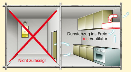 Diese Verbrennungsluftversorgung über die Außenfugen einer Wohnung ist aber ein äußerst sensibles Gebilde. Störungen werden meist durch unbedachte Manipulationen im Verbrennungsluftverbund verursacht. So findet man bei gekürzten Türblättern meist „Läufer“ oder die beliebten 80 cm langen „Strickdackel“ vor den Türen. Lüftungsgitter werden sehr häufig auch mit Folie zugeklebt. Teilweise verwenden die Saboteure dabei sogar Klarsichtfolie, die sie zwischen den Lamellengittern anbringen und so optisch eine intakte Lüftungsöffnung vortäuschen. Und oft wird mit der neuen Küche auch eine Dunstabzugshaube geliefert. Der Laie sieht keinen Zusammenhang zwischen dieser und seiner raumluftabhängigen Gastherme. Tritt sie dann in Aktion, steht der Unterdruck, der dann erzeugt wird, dem Schornsteinzug entgegen. Abgase werden am Abziehen behindert und dem Gasgerät bleibt buchstäblich die Luft weg. Bei Einsatz solcher unterdruckfördernden Apparate – dazu gehören auch Ablufttrockner – können so genannte „Soloschalter“ eingesetzt werden. Geht die Gasfeuerstätte in Betrieb, wird die Abzugshaube solange abgeschaltet. Eine Lösung, welche die Hausfrau nicht gerade begeistert. Sollen sich Dunstabzugshaube und Gasfeuerstätte nicht gegenseitig den Garaus machen, kann ein Fensterkippschalter eingebaut werden. Die Abzugshaube bekommt jetzt nur dann grünes Licht, wenn das Fenster geöffnet ist und so immer genügend Luft zuströmen kann.