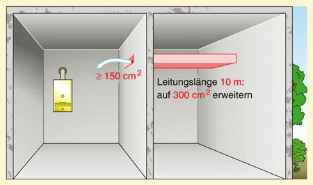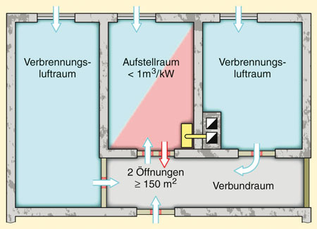 Aufstellungsraum angrenzender Raum der Wohnung genommen werden. Dieser benötigt – wie auch der Aufstellungsraum selber – keine Tür ins Freie und auch kein Fenster. Solche Außenfugen, über die Luft nachströmen kann, sind für Schutzziel 1 nicht nötig. Denn die Räume müssen ja nur für die sehr begrenzte Zeit des Anfahrzustandes Luft liefern. Um den Nachbarraum lufttechnisch zum Aufstellungsraum hinzurechnen zu können, muss die Verbindung der Räume über zwei Verbrennungsluftöffnungen mit einem Querschnitt von jeweils 150 cm2 erfolgen. Dabei müssen die Öffnungen so weit auseinander liegen, dass durch sie eine ständige Luftzirkulation erreicht wird. Am besten, sie sind unten und oben in der Tür zum Aufstellungsraum angebracht. Dort haben die Kunden auch die größten Probleme, diese „verschwinden“ zu lassen.