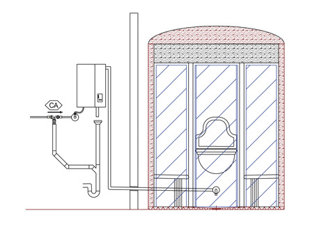 Viele Dampfkabinen werden heute zur Heiß/Kalt-Anwendung mit so genannten Kneipp-Schläuchen ausgerüstet. Diese Schläuche werden über ein herkömmliches Auslaufventil benützt. Sie dienen aber nicht immer nur der gesundheitlichen Anwendung, sondern oftmals auch zum Ausspritzen der Kabine oder zur Befüllung von Putzeimern. Vorausgesetzt der Schlauch wurde nicht zu lang bemessen und liegt mit dem offenen Ende auf dem Kabinenboden, können wir hier von einem Risiko der Flüssigkeitsketegorie 3 ausgehen. Das Auslaufventil sollte also, da es üblich in ca. 1,20 m Höhe montiert ist, mindestens mit einer Sicherungskombination Typ HD versehen sein, bestehend aus einem Schlauchbelüfter und einem Rückflußverhinderer.