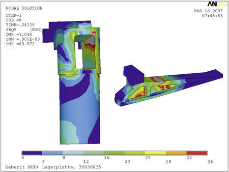 Ihre einwandfreie Funktion wird anschließend in umfassenden Tests geprüft. Dabei müssen die Prototypen Praxistests über sich ergehen lassen, an denen Installateure beteiligt sind. Der Profi prüft dabei zunächst noch im Bauphysik-Labor, wie sich das neue Produkt im wirklichen Leben so macht. Denn die meisten Konstruktionsfehler stellen sich ja bekanntlich bei Gebrauch heraus. Um eine möglichst frühe Aussage über die Belastbarkeit, Verformbarkeit und die Lebensdauer abzuleiten, wird die Belastung der neuen Teile auch rechnerisch ermittelt. Die rechnerische Überprüfung ist nur eine von allen erdenklichen Eigenschaften auf die neue Produkte in Geberit-Labors getestet werden. Es gilt die Montagefreundlichkeit für den Installateur, die Sicherheit für den Planer, das Design für den Architekten und die Funktionalität für den Endverbraucher zu optimieren. In dieser Phase wird auch das Beschaffungs- und Fertigungskonzept erarbeitet. Für die Auswahl der geeigneten Kunststoffe und der Gestaltung der Bauteile berät die Verfahrenstechnik die Produktentwicklung. Vor der Herstellung der ersten Spritzgusswerkzeuge wird der Füllvorgang am Computer simuliert. Die daraus gewonnenen Erkenntnisse fließen in die Werkzeugkonstruktion ein.