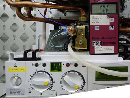 Nachdem der Fülldruck aufgebracht und das Gerät entlüftet wurde, ist eine abschließende Dichtheitskontrolle der wasserführenden Bauteile notwendig. Schließlich gilt es noch die Verbindungsstücke der Abgasleitung zu kontrollieren. Ist noch kein Loch im Verbindungsstück für die Mess-Sonde vorhanden, muss eines mit einem Durchmesser von 12 bis 14 mm hergestellt werden. Es soll in einem Abstand, der dem doppelten Abgasrohrdurchmesser (d) entspricht, von der Oberkante der Strömungssicherung entfernt liegen. Bevor die Inbetriebnahme des Gerätes weitergehen kann, muss der Gas-Anschlussdruck (als Fließdruck) ermittelt werden. Der Gerätehersteller gibt in der Installationsanleitung die Gasanschlussdrücke an, die zu einer Inbetriebnahme nachgewiesen werden müssen. Dazu wird das Manometer am Gasanschlussdruck-Messnippel, in Fließrichtung gesehen vor der Gasregelarmatur, angeschlossen. Der Anschlussdruck muss bei Gerätemaximalleistung ermittelt werden. Dazu ist es notwendig, Geräte- und herstellerspezifische Prüfprogramme zu starten.