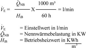 Passt der Anschlussdruck, wird im zweiten Step die werkseitige Gaseinstellung kontrolliert. Das Manometer wird dazu am Düsendruck-Messnippel angeschlossen. Die weitere Vorgehensweise zur Gaseinstellung muss streng nach der Installationsanleitung ablaufen. In der Regel wird zuerst die maximale Geräteleistung und danach die minimale Geräteleistung, auch Startlast genannt, überprüft und gegebenenfalls eingestellt. Da bei der manometrischen Kontrolle nur der Düsendruck und nicht der tatsächliche Gasdurchsatz (Einstellwert) überprüft wird, muss der Gasdurchsatz für die maximale Geräteleistung zusätzlich nach der volumetrischen Methode kontrolliert werden. Hier die Formel zur Ermittlung des erforderlichen Einstellwertes: