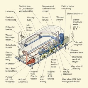 Damit das Bad in der Whirlwanne auch jederzeit ein gesundes Vergnügen bleibt, ist ein hygienischer Umgang mit dieser eine wichtige Voraussetzung. Wird die Wanne benutzt, drückt das Badewasser in die Düsenöffnungen. Dies natürlich auch dann, wenn die Whirlfunktion gar nicht genutzt wird. Um zu verhindern, dass Badewasser in den Schläuchen des Systems verbleibt und sich dort Bakterien vermehren können, muss das System nach jedem Bad mit frischem Wasser durchgespült werden. Ferner empfiehlt es sich, die Anlage einmal wöchentlich zu desinfizieren. Vorgenanntes setzt natürlich voraus, dass Schläuche und Rohre der Wanne so angebracht sind, dass diese sich vollständig entleeren können. Und noch eines muss bei Wannen mit Wellness-Funktionen beachtet werden: Nach DIN EN 1717 [1] ist es zulässig, einen Wassereinlauf unterhalb des Wannenrandes im häuslichen Bereich lediglich mit einer Sicherungskombination (Rückflussverhinderer und Belüfter) abzusichern. Damit erfolgt eine Absicherung gegen Badewasser entsprechend der Flüssigkeitskategorie drei (gesundheitsgefährdend durch wenig giftige Stoffe). Beim Desinfizierungsprozess einer Whirlwanne kann sich in dieser allerdings Wasser befinden, das der Flüssigkeitskategorie vier zuzuordnen ist (gesundheitsgefährdend durch giftige oder sehr giftige Stoffe). Genau in diesem Moment ist eine Sicherungskombination als Absicherung des Trinkwassers vor dem Wannenwasser nicht mehr ausreichend. In diesem Fall muss der Einlauf unterhalb des Wannenrandes mit einem Rohrunterbrecher abgesichert werden.