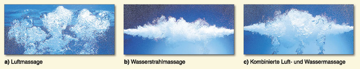 Bei der Luftmassage leitet ein Gebläse temperierte Luft durch am Wannenboden und / oder an den Wannenseiten befindliche Düsen. Diese sind in regelmäßigen Abständen verteilt und garantieren ein bequemes Sitzen und Liegen in der Wanne. Die Verwirbelung des Wassers durch Luft ermöglicht eine wohltuende, gleichmäßige Massage. Für Menschen, die besonderen Wert auf Ruhe legen, sind die Whisper-Systeme ideal. Die Luft- und Wasserpumpen des Whisper- Systems sind Spezialanfertigungen, die sehr leise arbeiten. Dadurch wirken Whirlwannen mit Whisper-Technik besonders entspannend - selbst auf höchster Regelstufe. Bei der Wasserstrahlmassage wird Wasser aus dem Wanneninneren abgesaugt, beschleunigt, mit Luft angereichert und mit wählbarem Druck über spezielle Einlassdüsen in die Wanne zurückgeführt. Die Düsen befinden sich an den Wannenseiten. Die Strahlrichtung und die Strahlstärke könne individuell gewählt werden: von einer sanften bis zur gezielten, starken Massage. Besonders nach sportlicher Betätigung kann eine Wasserstrahlmassage der Bildung von Milchsäure in den Muskeln und somit auch einem unangenehmen „Muskelkater“ vorbeugen. Die kombinierte Luft- und Wassermassage stellt eine Kombination der zuvor beschriebenen Whirlsysteme dar. Düsen im Bodenbereich, die durch Luftbläschen das Wasser soft verwirbeln, und Düsen an den Seiten. Das System „Wasser/Luft“ garantiert eine optimale Verwirbelung des Wassers und dient zur gleichmäßigen Massage des ganzen Körpers.