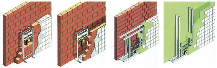 Eine andere Technik, die heute schon aus Platzgründen nur noch selten Frage kommt, ist das Vormauern. Dazu werden die Montageelemente an der Rohwand angebracht und nach der Leitungsinstallation wird vor den Elementen eine eigenständige Wand gemauert. Das macht zwar den Schallschutz gut beherrschbar, ist aber kostenintensiv und zeitaufwändig. Bei den Arbeiten entsteht unvermeidbar Schmutz und man verliert einen nicht unerheblichen Anteil an Raum-Grundfläche. Daher ist auch diese Technik heute nicht mehr die Standardlösung..