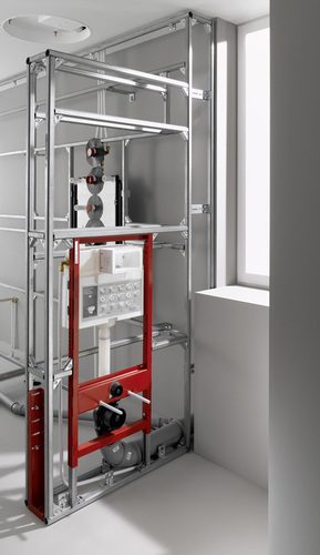 Montagerahmen werden direkt vor der Rohwand befestigt und müssen eingemauert werden, damit sie die nötige Stabilität erhalten um später wandhängende Sanitärobjekte sicher zu tragen. Montageständer bestehen aus stabilem Profilstahl. Sie werden ebenfalls vor der Rohwand angebracht, allerdings ist bei diesen kein Einmauern nötig, um die notwendige Festigkeit zu erreichen. Daher können sie auch in einer Leichtbauwand, die als Vorwand gesetzt wird, Verwendung finden. Sollen Montageständer in ein Schienensystem integriert werden, werden sie in Einzelschienen oder in durchgehenden Wandschienen eingehängt. Am Fußboden werden sie höhenverstellbar befestigt. Durchgehende Wand- und Bodenschienen erleichtern es erheblich, die einzelnen Montageständer in Flucht zu bringen. Zudem vereinfachen die Schienen die Befestigung. In Installationsblöcken sind Armaturen bereits eingebaut und mit den Auslaufanschlüssen, z. B. für Wanne und Brause, fertig verrohrt. In den Aussparungen hinter den Blöcken können Rohrleitungen vorbeigeführt werden. Die Installationsblöcke werden an der Rohwand und mittels Fußstützen auf dem Fußboden befestigt. Auf diese Weise erreichen sie die nötige Stabilität, um später die Belastung durch wandhängende Sanitärobjekte aushalten zu können. Neben ihrer Verwendung in der Trockenbau-Vorwand können sie auch durch Ein- und Ausmauern in die Mauer einbezogen werden.