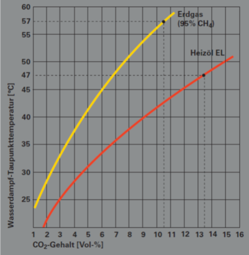 und Heizöl ergeben sich unterschiedliche Wasserdampf-Temperaturen, bei denen der Wasserdampf im Heizgas kondensiert. Im nahstöchiometrischen Bereich liegt die Wasserdampf-Taupunkttemperatur für Erdgas bei ca. 57°C, für Heizöl EL bei ca. 47°C.